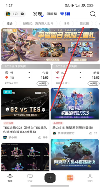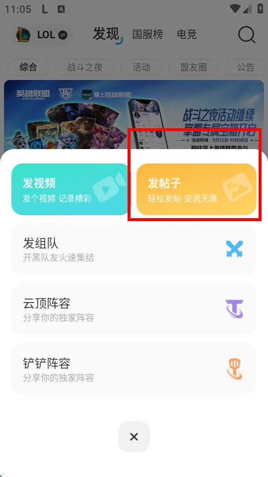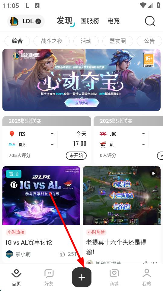 1、打開掌上英雄聯(lián)盟App,進(jìn)入發(fā)現(xiàn)頁面,點擊底部中間的+號圖標(biāo)。