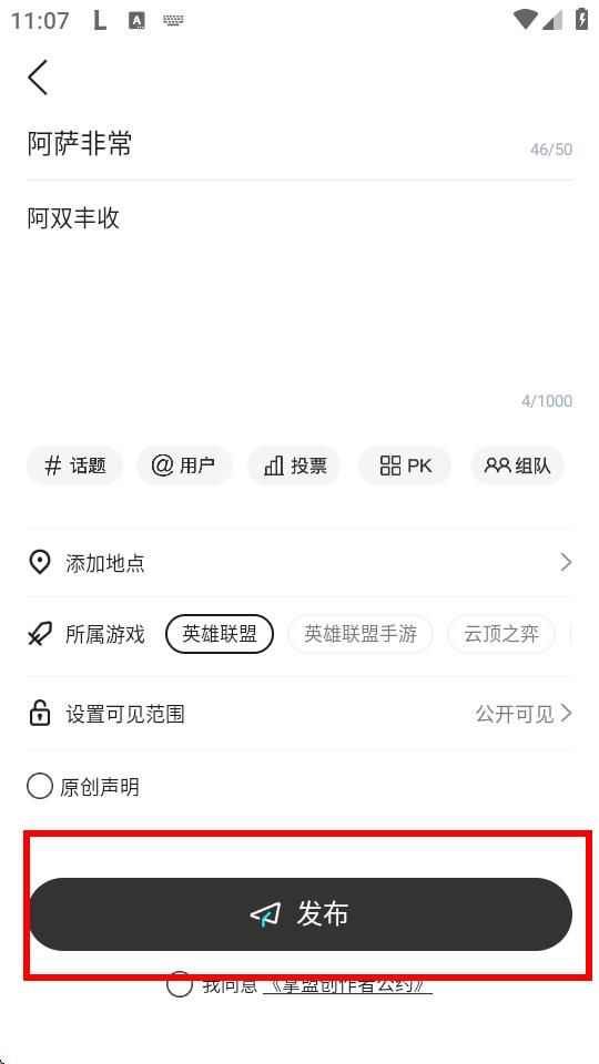 4、還能添加話題、發(fā)起投票等,選擇所屬游戲,設(shè)置可見范圍,勾選同意后,點擊發(fā)布按鈕,即可成功發(fā)布動態(tài)。