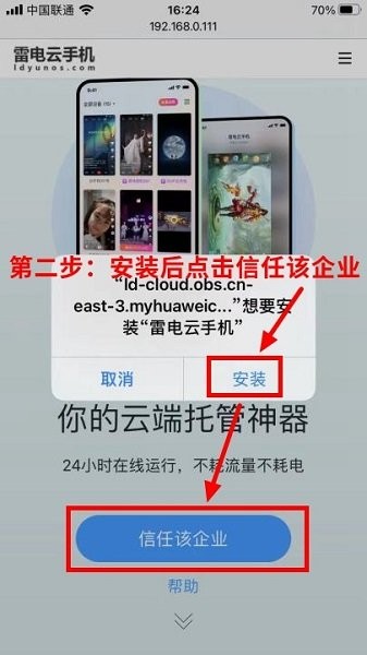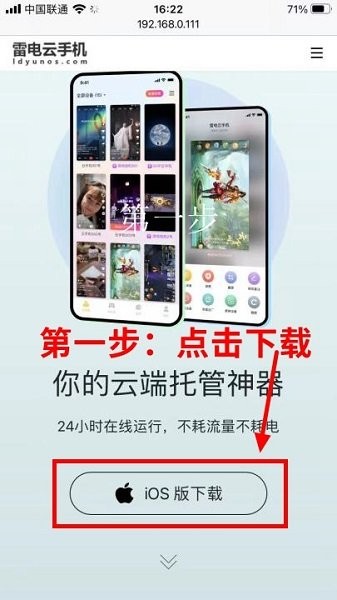 第一步,進入我們下載頁點擊安裝,或進入雷電云手機官網(wǎng),點擊ios下載按鈕