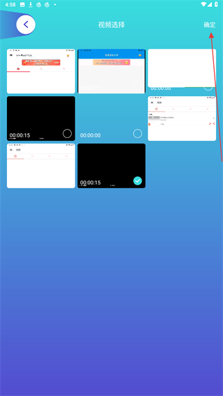 3、在視頻選擇的頁(yè)面內(nèi),選擇并點(diǎn)擊右上角確定的按鈕。