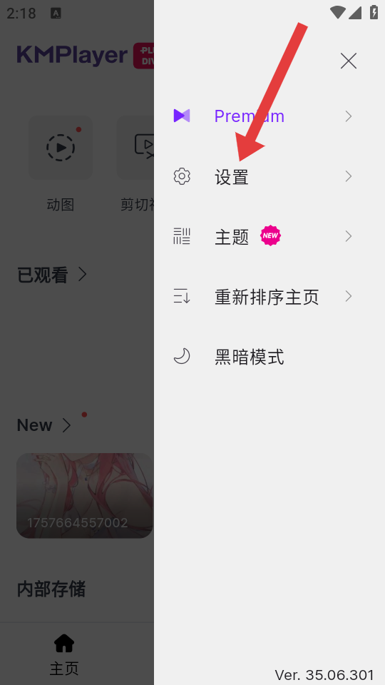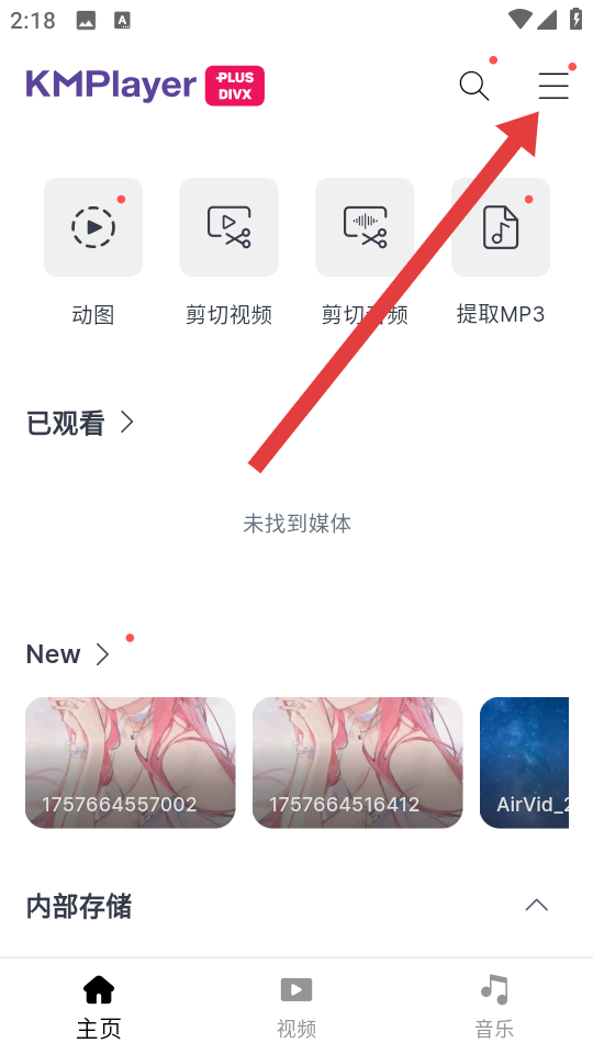 1、在KMPlayer Plus的主頁,點擊右上角的菜單圖標,打開功能菜單。