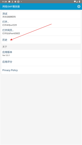 1、打開網(wǎng)極swf播放器的APP,在首頁(yè)內(nèi)點(diǎn)擊歷史的按鈕。