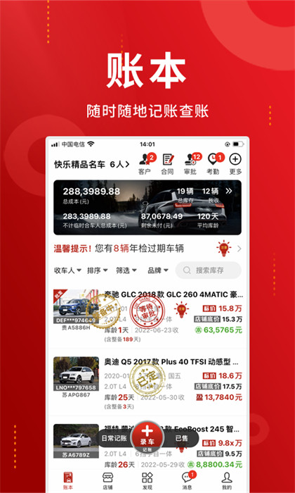 適合多人合伙做二手車生意的車行使用;可以一人或者多人共同記賬共享車源賬單;財務(wù)公開透明;所有人隨時隨地記賬、查賬、歷史車源統(tǒng)計分析等等功能;