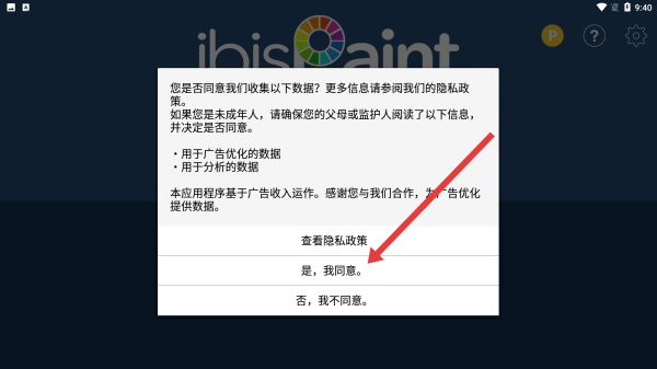 1、ibisPaint啟動時彈出隱私政策彈窗,點擊是,我同意,同意數(shù)據(jù)收集條款以繼續(xù)使用應用。