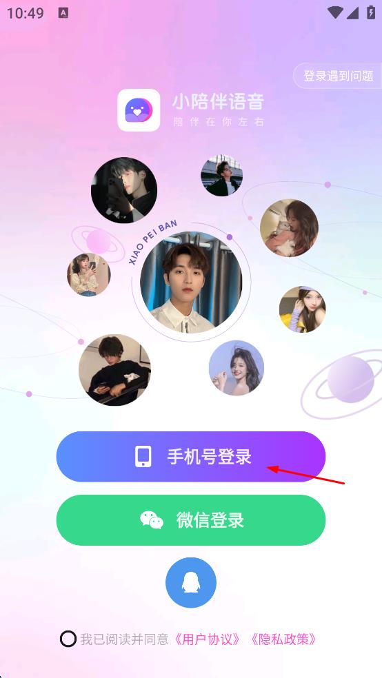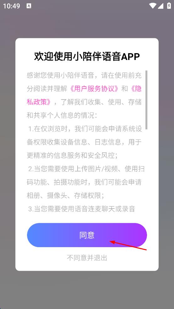 1、打開(kāi)小陪伴語(yǔ)音,會(huì)出現(xiàn)用戶服務(wù)協(xié)議及隱私政策界面,仔細(xì)閱讀后點(diǎn)擊“同意”,進(jìn)入軟件登錄選擇頁(yè)面。