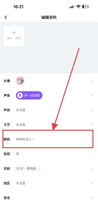 4、在編輯頁(yè)面找到昵稱(chēng)選項(xiàng)并點(diǎn)擊,輸入新昵稱(chēng)后保存,即可完成名字修改。
