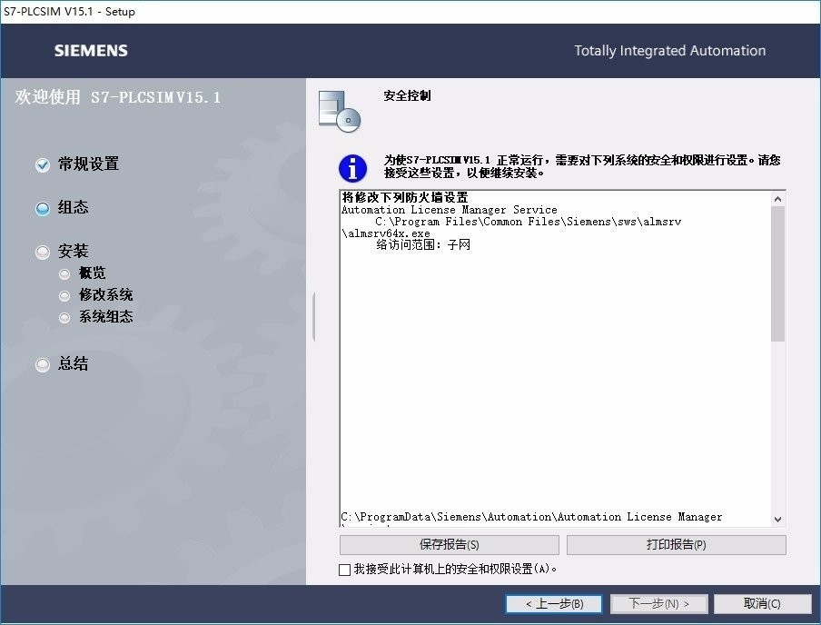 為使S7 -PLCSI- V115.1正常運行,需要對下列系統(tǒng)的安全和權限進行設置請您接受這些設置,以便繼續(xù)安裝。