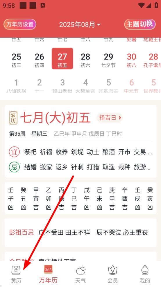 1、打開老黃歷APP,點(diǎn)擊底部導(dǎo)航欄里的黃歷選項(xiàng),進(jìn)入黃歷顯示頁(yè)面。