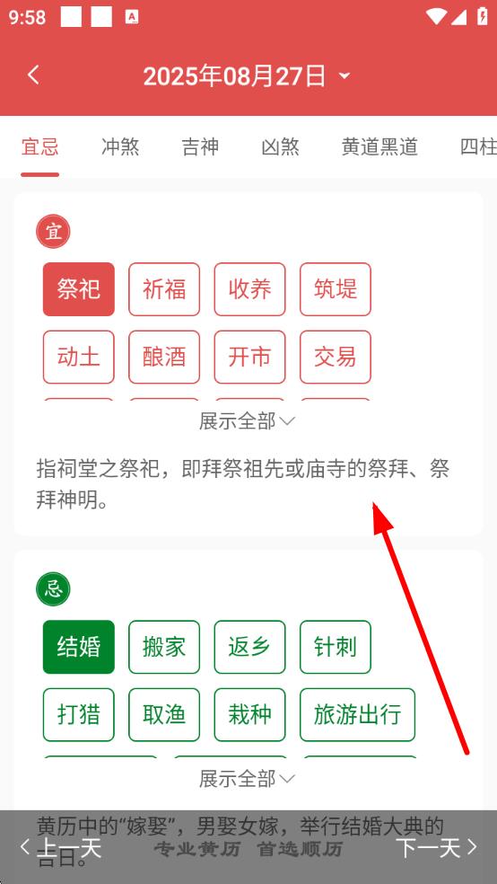 3、點(diǎn)擊宜或忌區(qū)域下方的展示全部,就能看到當(dāng)天詳細(xì)的宜做和忌諱事項(xiàng)。