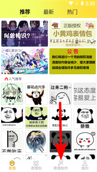 1、在表情包大全APP推薦頁面,點(diǎn)擊底部表情制作選項(xiàng),進(jìn)入表情制作頁面。