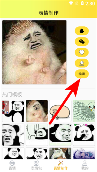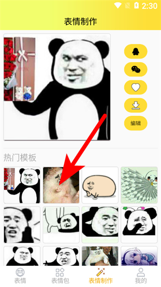 2、在表情制作頁面,點(diǎn)擊熱門模板中的目標(biāo)模板,進(jìn)入模板編輯界面。