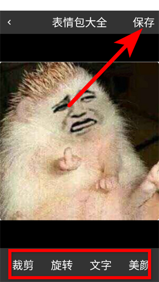 4、可進(jìn)行裁剪、旋轉(zhuǎn)、添加文字、美顏等操作,點(diǎn)擊保存按鈕,即可完成表情包制作操作。