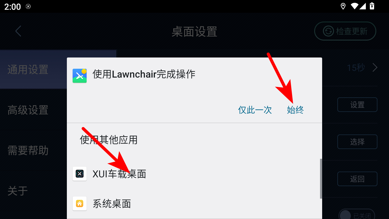4、在應(yīng)用選擇窗口中,選擇XUI車載桌面后點擊始終選項,即可將其設(shè)置為默認桌面。