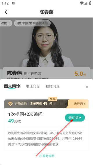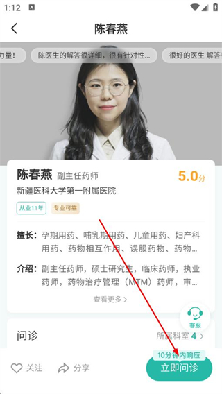 3、進(jìn)入醫(yī)生詳情頁面后,點(diǎn)擊立即問診。