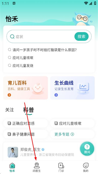 1、打開怡禾健康A(chǔ)PP,點(diǎn)擊導(dǎo)航欄中的問醫(yī)生。