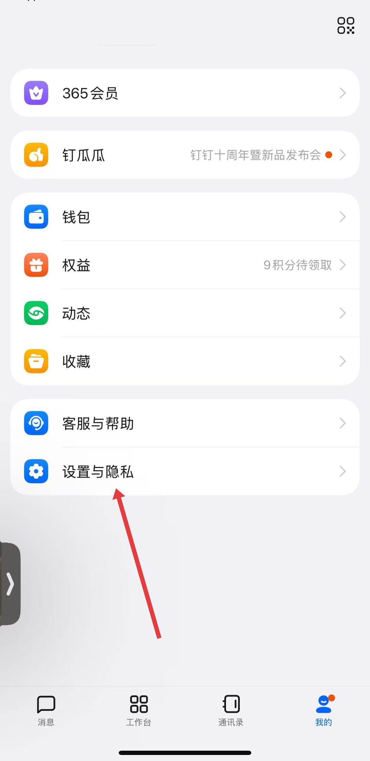 1、打開釘釘應(yīng)用,點擊底部導(dǎo)航欄我的,進(jìn)入個人頁面,點擊設(shè)置與隱私選項。