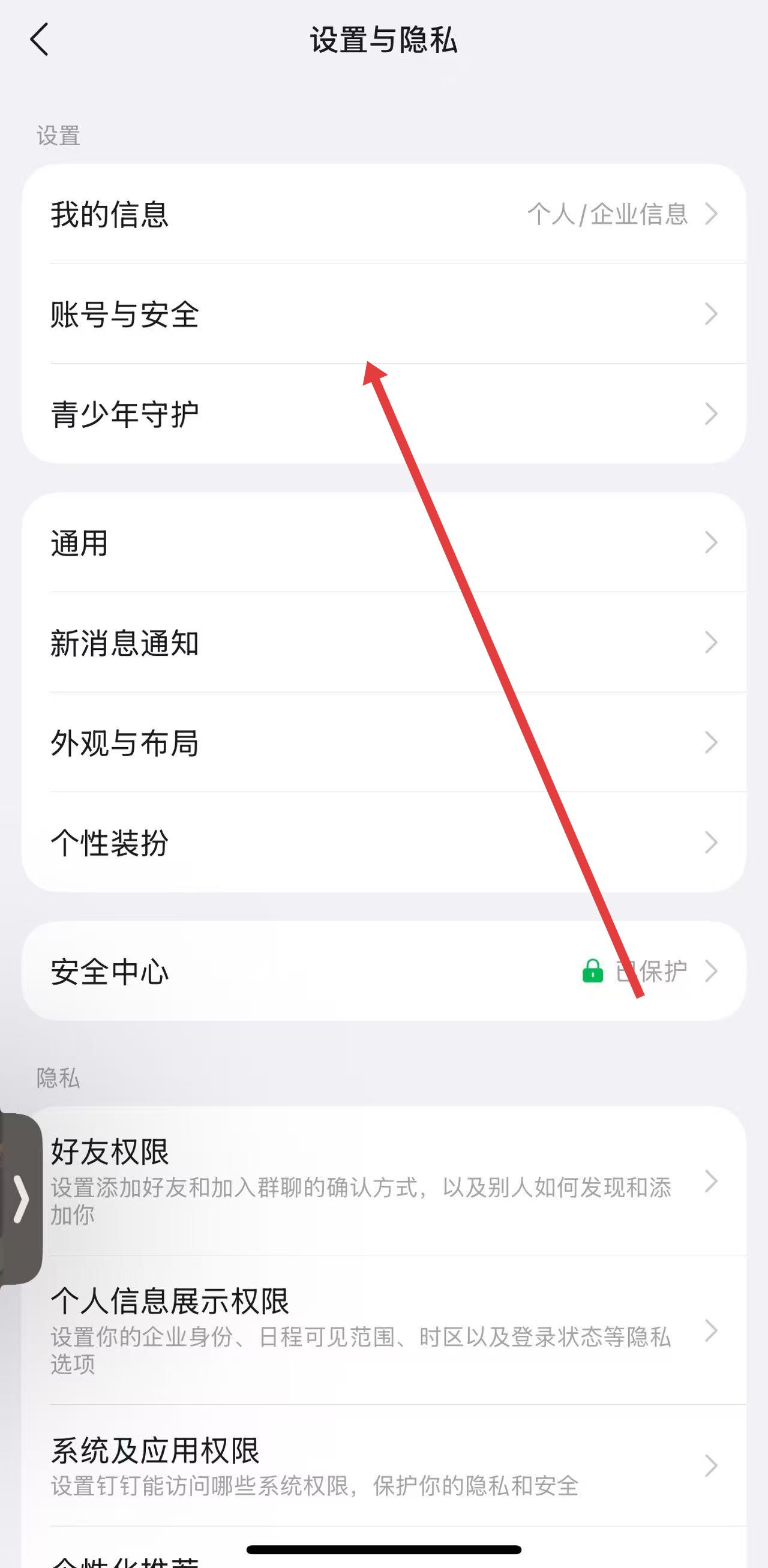 2、在設(shè)置與隱私頁面,點擊賬號與安全選項。