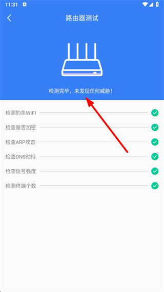 4、等待檢測(cè)完成,即可查看路由器的相關(guān)檢測(cè)結(jié)果,包括是否有釣魚(yú)WIFI、是否加密等信息。