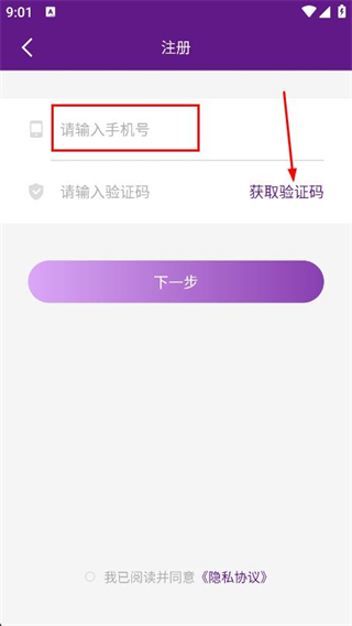 2、在注冊頁面,輸入手機號碼,并點擊獲取驗證碼。