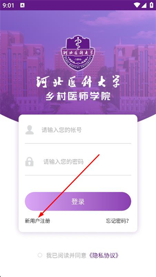 1、打開河北鄉(xiāng)醫(yī)app,在登錄頁面點擊新用戶注冊。