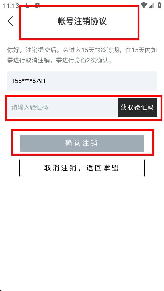 4、仔細(xì)閱讀帳號(hào)注銷(xiāo)協(xié)議,然后點(diǎn)擊獲取驗(yàn)證碼,輸入收到的驗(yàn)證碼,點(diǎn)擊確認(rèn)注銷(xiāo)。