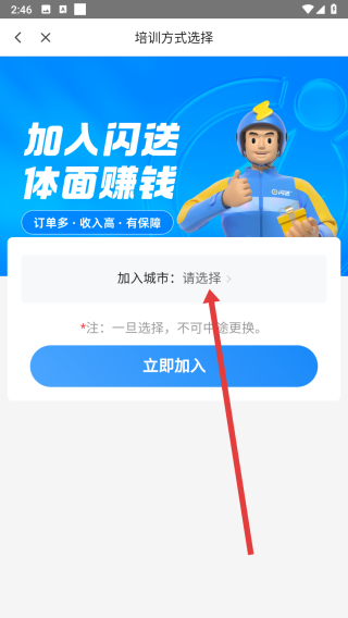 1、在登錄成功后,進(jìn)入培訓(xùn)方式選擇頁面,點(diǎn)擊箭頭指向處選擇城市。