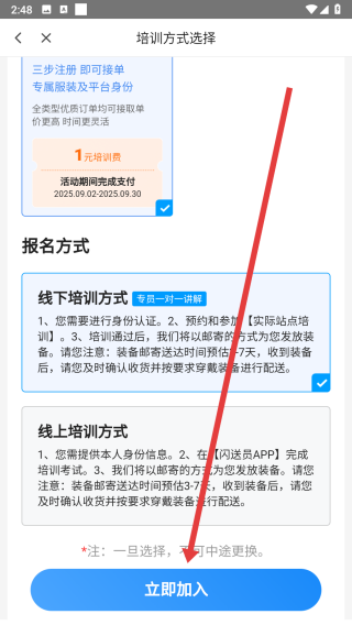 3、可以選擇線下培訓(xùn)方式,選擇好后點(diǎn)擊立即加入,進(jìn)行后續(xù)操作。