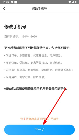 3、在修改手機(jī)號(hào)頁面點(diǎn)擊下一步按鈕,進(jìn)入驗(yàn)證碼輸入頁面。