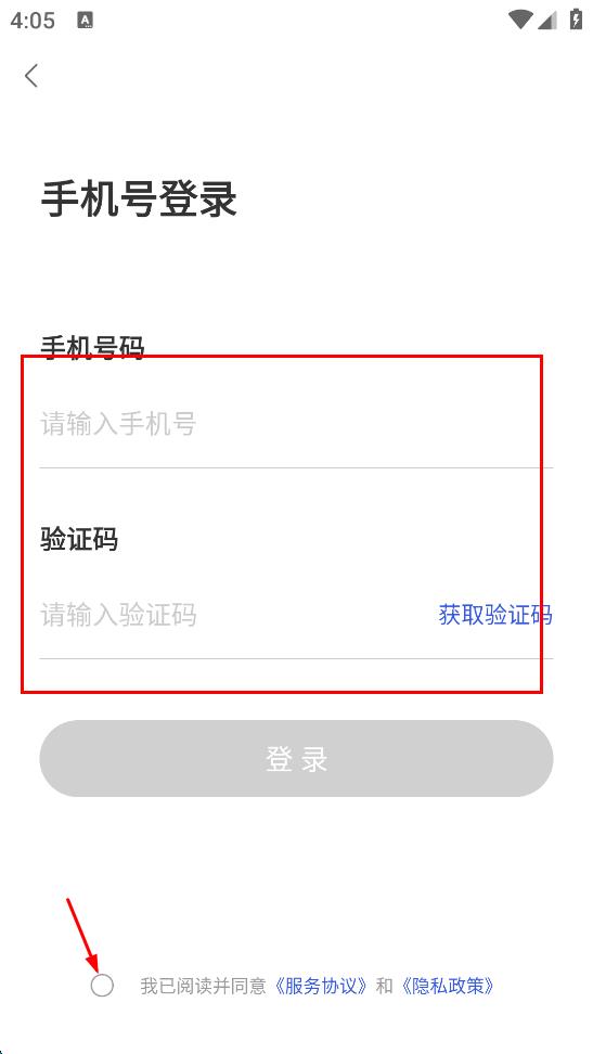 4、輸入手機(jī)號(hào),點(diǎn)擊“獲取驗(yàn)證碼”,輸入收到的驗(yàn)證碼,勾選同意協(xié)議,點(diǎn)擊“登錄”按鈕,完成登錄操作。