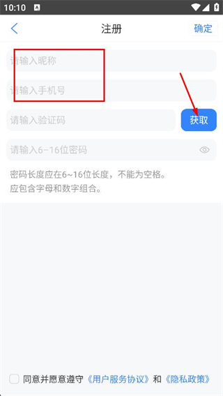 2、進入注冊頁面后,輸入昵稱和手機號,點擊獲取驗證碼。