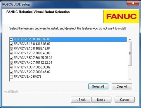 9)顯示“ROBOGUIDE設置 - FANUC Robotics虛擬機器人選擇”窗口。 選擇虛擬機器人的版本,然后單擊“下一步>”按鈕。如果您點擊“全選”按鈕,所有版本都被選中。 如果單擊“全部清除”按鈕,則所有版本都未選中。