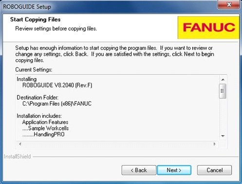 10)顯示“ROBOGUIDE設置 - 開始復制文件”窗口。 檢查安裝設置,然后單擊“下一步>”按鈕。