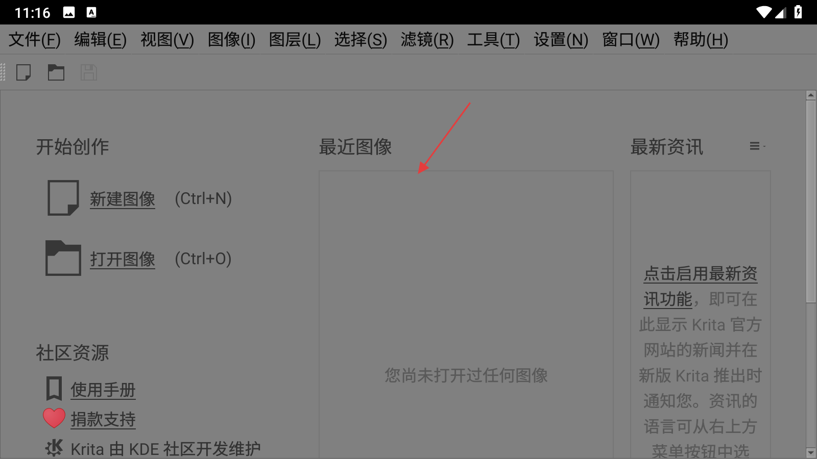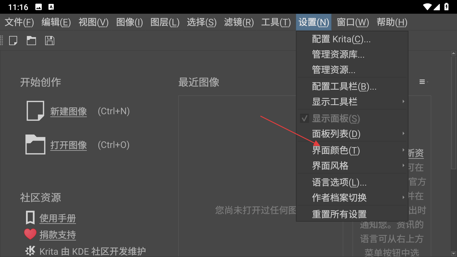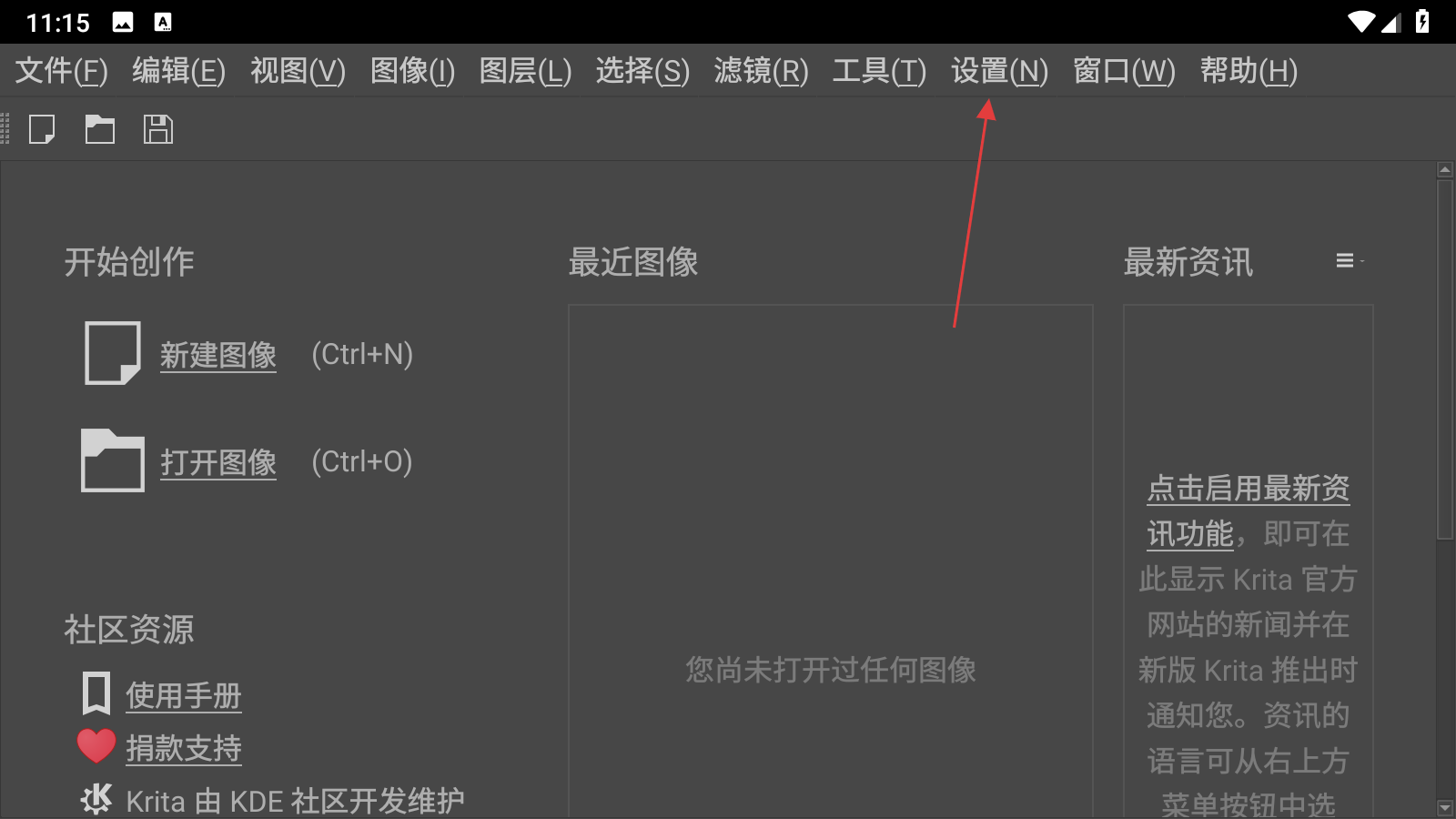 1、打開Krita軟件,在頂部菜單欄中找到設(shè)置選項(xiàng)并點(diǎn)擊,展開設(shè)置的下拉菜單。