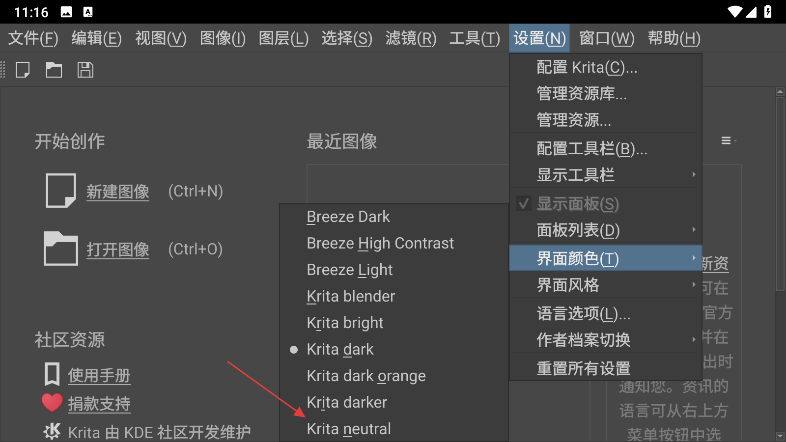 4、選擇完成后,Krita的界面顏色會(huì)立即更新為所選主題的樣式,完成界面顏色的更換。