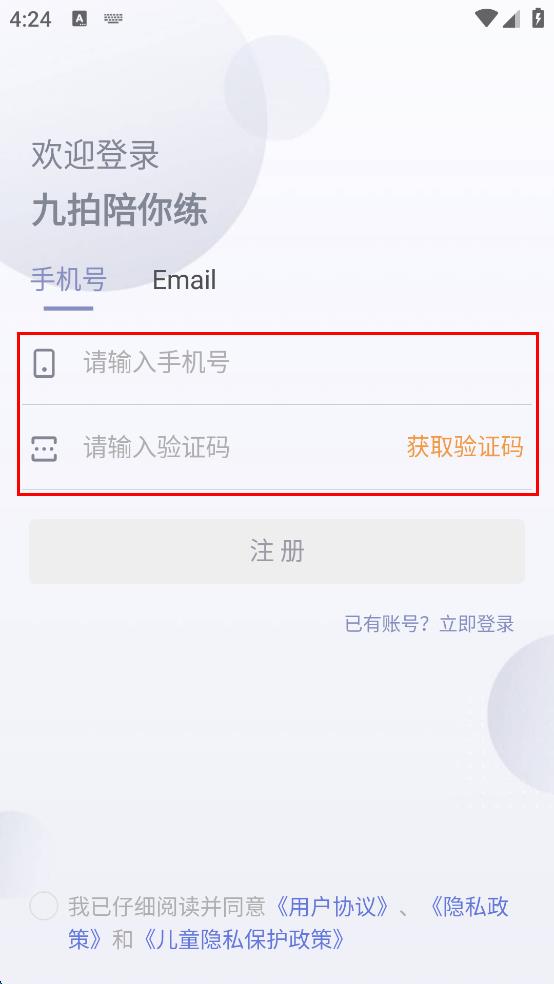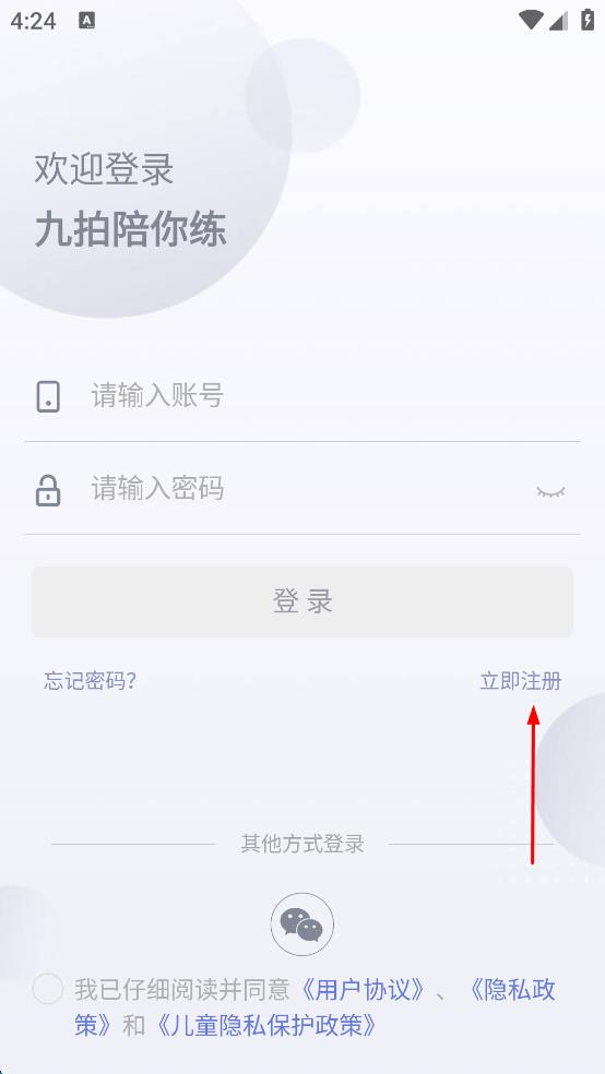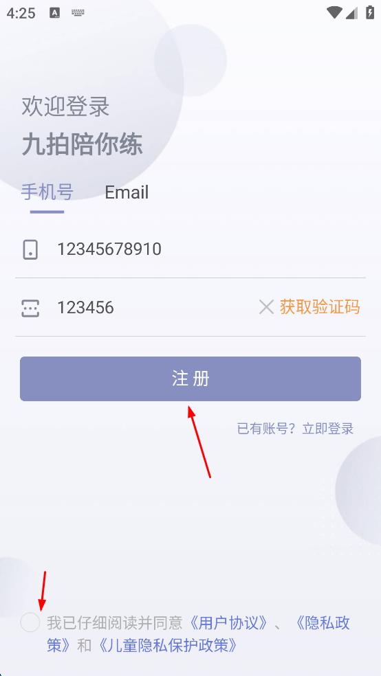 4、勾選我已仔細(xì)閱讀并同意用戶協(xié)議,隱私政策和兒童隱私保護(hù)政策,然后點(diǎn)擊“注冊”按鈕,完成九拍陪你練APP的注冊操作。