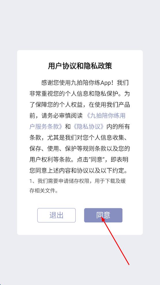 1、打開九拍陪你練APP,進(jìn)入用戶協(xié)議和隱私政策頁面,仔細(xì)閱讀相關(guān)內(nèi)容后,點(diǎn)擊“同意”按鈕,進(jìn)入登錄頁面。