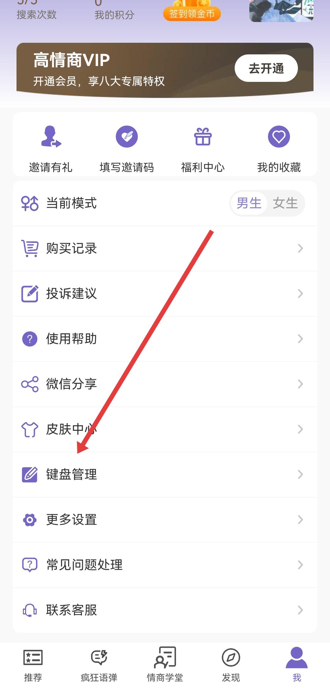 1、在我的頁(yè)面,點(diǎn)擊鍵盤(pán)管理的選項(xiàng),進(jìn)入鍵盤(pán)管理的界面。