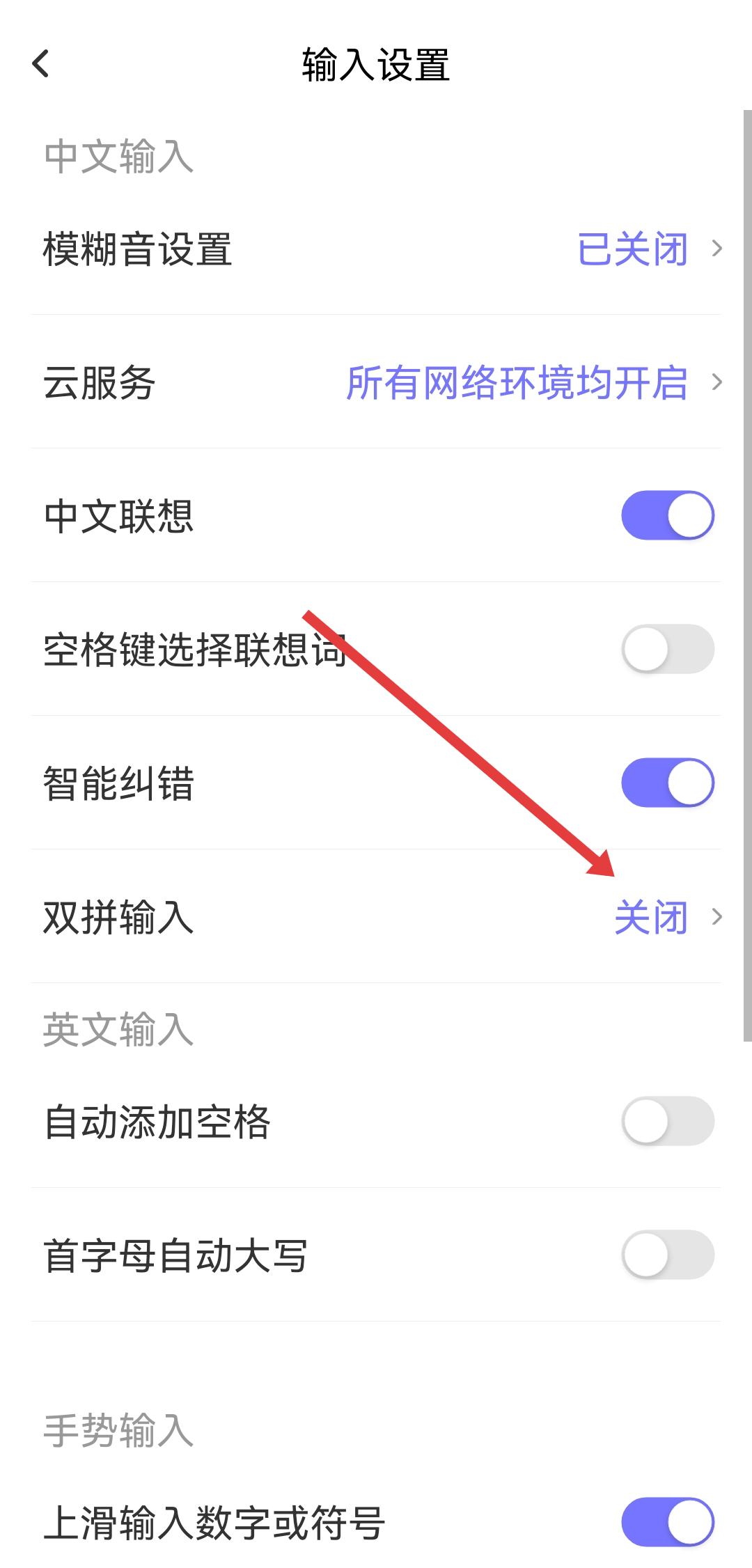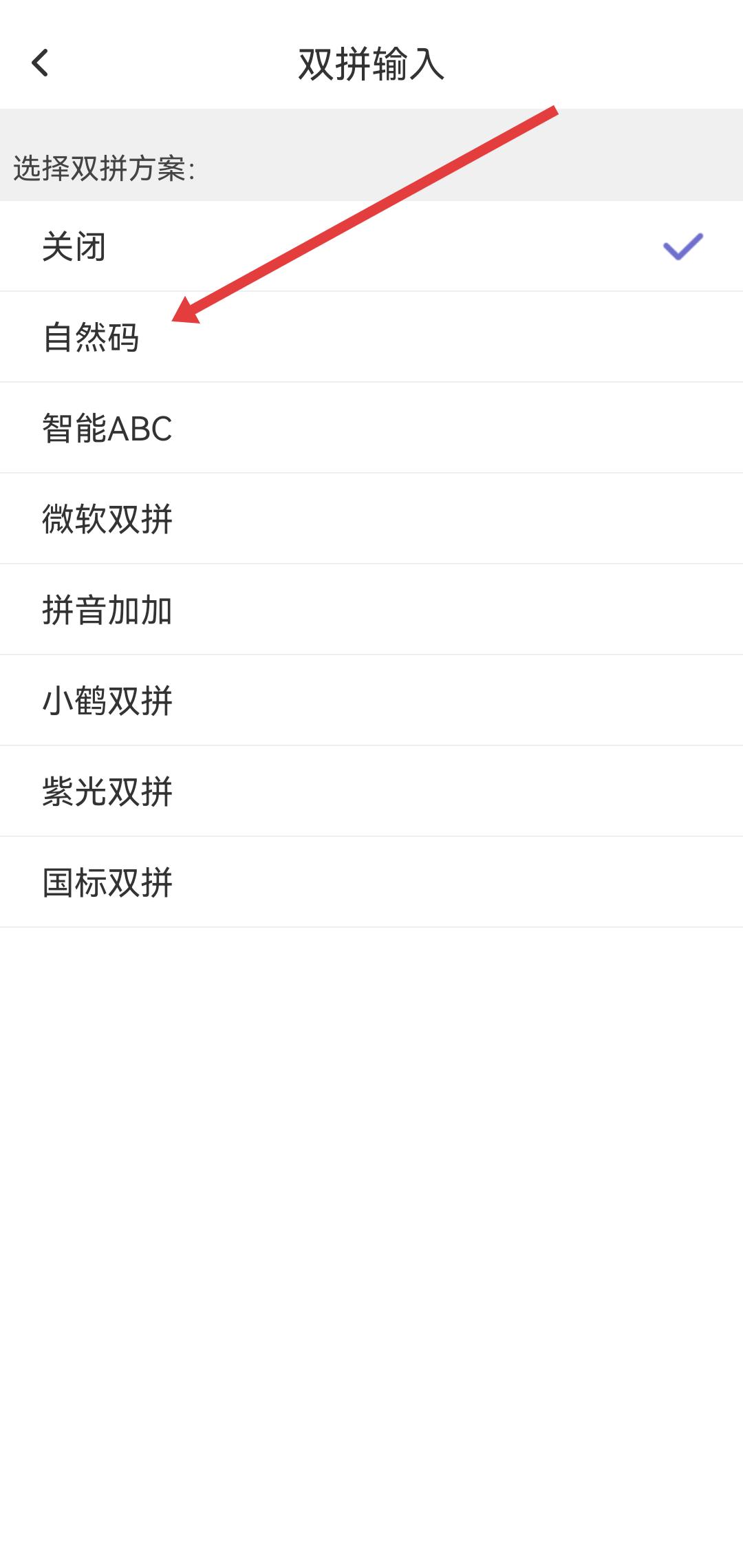 3、在輸入設(shè)置頁(yè)面,點(diǎn)擊雙拼輸入選項(xiàng),進(jìn)入雙拼方案選擇界面。