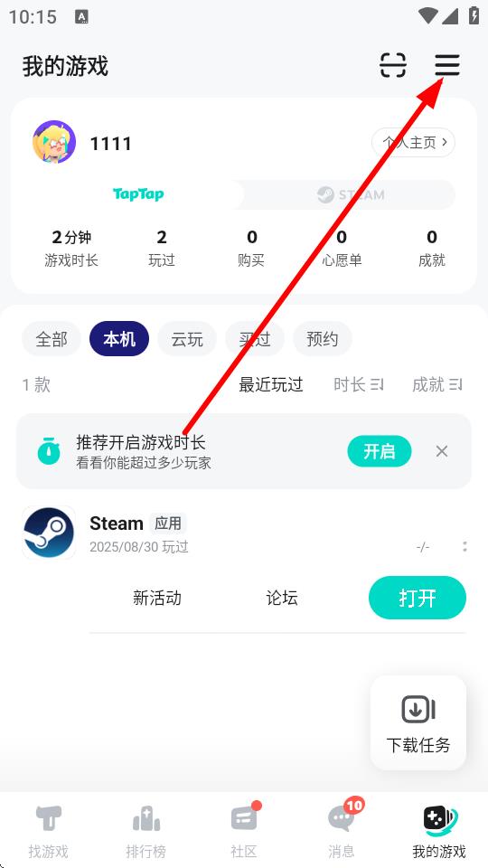1、打開Taptap應(yīng)用進(jìn)入我的游戲頁面,點擊右上角三條橫線圖標(biāo)進(jìn)入設(shè)置界面。