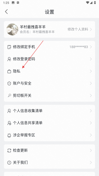 3、在設(shè)置界面中,點(diǎn)擊隱私選項(xiàng),進(jìn)入隱私設(shè)置頁(yè)面。