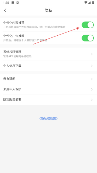 4、在隱私設(shè)置頁(yè)面,找到個(gè)性化內(nèi)容推薦選項(xiàng),點(diǎn)擊其右側(cè)的開關(guān)按鈕,將其關(guān)閉。