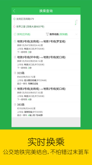 一站式換乘:根據(jù)您的需要,完美結(jié)合公交,地鐵和步行導(dǎo)航推送兩地之間的換乘方案,同步更新?lián)Q乘車輛的實(shí)時(shí)位置動(dòng)態(tài)。