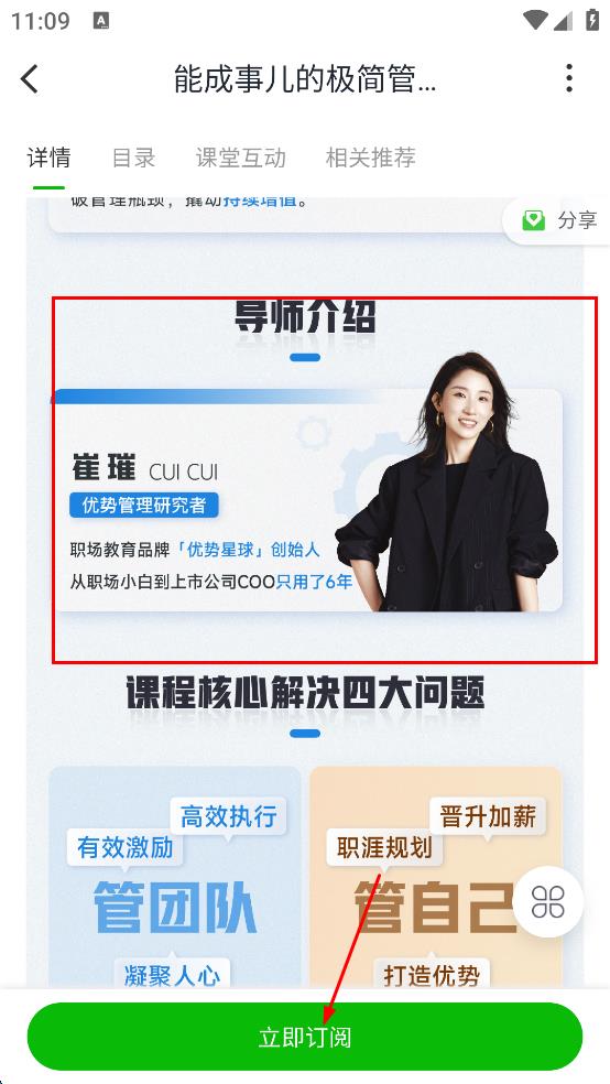 4、繼續(xù)向下瀏覽頁面,可查看導(dǎo)師介紹等更多課程相關(guān)信息,若確定要訂閱該課程,點(diǎn)擊頁面下方的“立即訂閱”按鈕,即可完成課程訂閱。