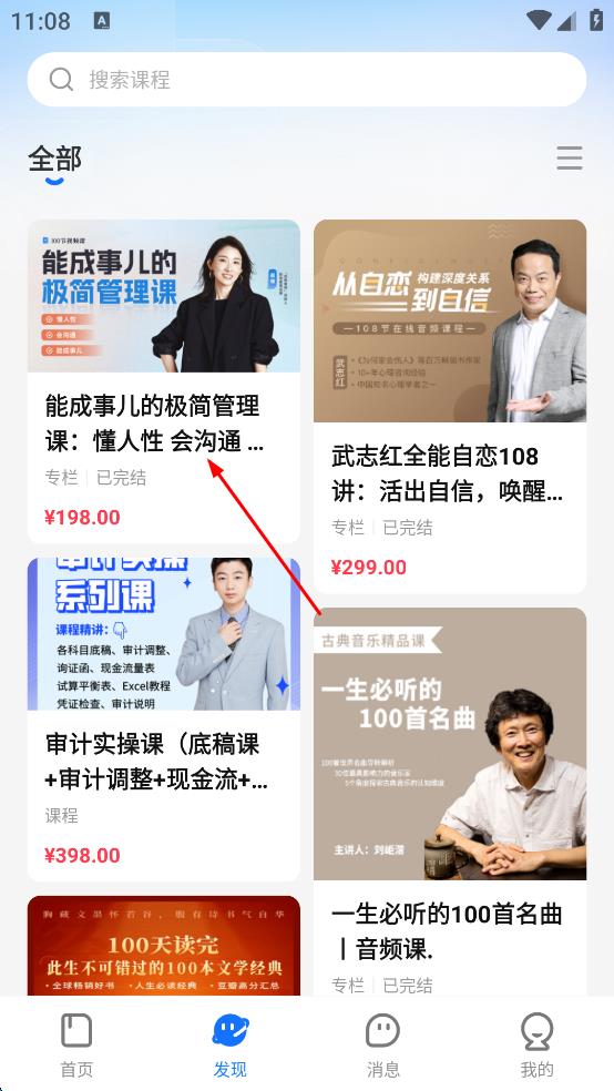 2、在發(fā)現(xiàn)頁面,找到搜索框,可直接搜索課程,也可瀏覽頁面展示的課程,選擇感興趣的課程,比如“能成事兒的極簡(jiǎn)管理課”,點(diǎn)擊該課程,進(jìn)入課程詳情頁面。