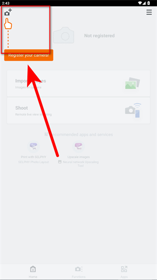 1、打開Camera Connect應(yīng)用,點(diǎn)擊左上角添加相機(jī)圖標(biāo)進(jìn)入相機(jī)注冊(cè)。