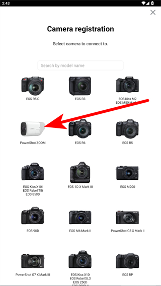 2、在相機(jī)注冊(cè)界面眾多型號(hào)中,選中自己要連接的相機(jī)款式。