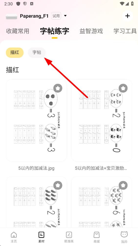 2、在素材頁面中,在字帖練字板塊,點(diǎn)擊字帖選項(xiàng),瀏覽字帖列表。