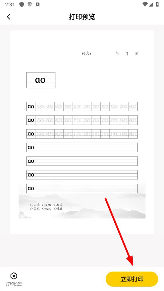 4、進(jìn)入字帖詳情后,點(diǎn)擊右下方立即打印按鈕,按照提示完成打印操作即可。