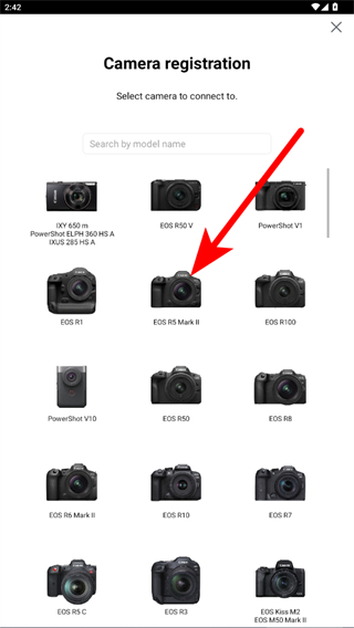 2、在相機(jī)注冊(cè)界面,從列表中選擇你要連接的相機(jī)型號(hào),比如EOS R5Mark II。