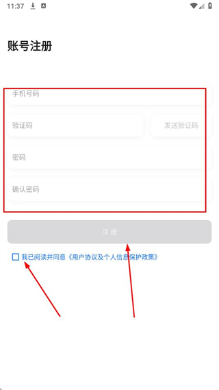 2、輸入手機號碼,填入驗證碼,設(shè)置密碼并確認。勾選用戶協(xié)議,點擊注冊。